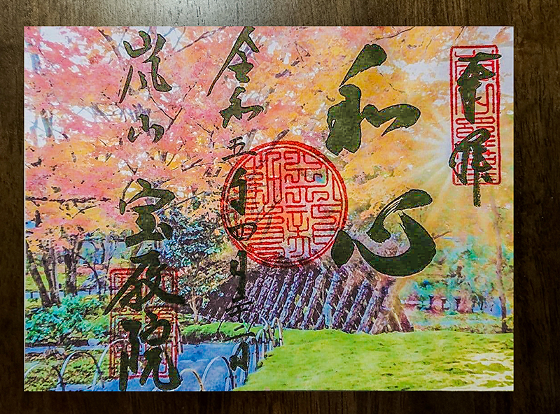 宝厳院が誇る獅子吼の庭に植栽される真っ赤に紅葉したモミジや黄色葉の紅葉、青々とした緑葉のモミジを水彩画で描いた芸術的な御朱印。
