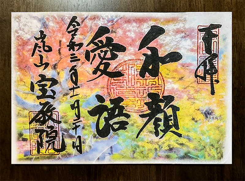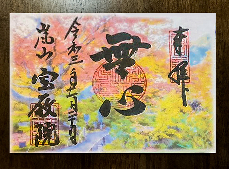右端に参拝、左端に「嵐山 宝厳院」その隣に参拝日、そして中央に大きくその日の住職の気分で墨書きされた仏語の墨書きが‥あっちゃぅ。