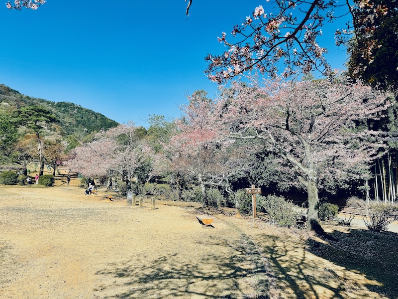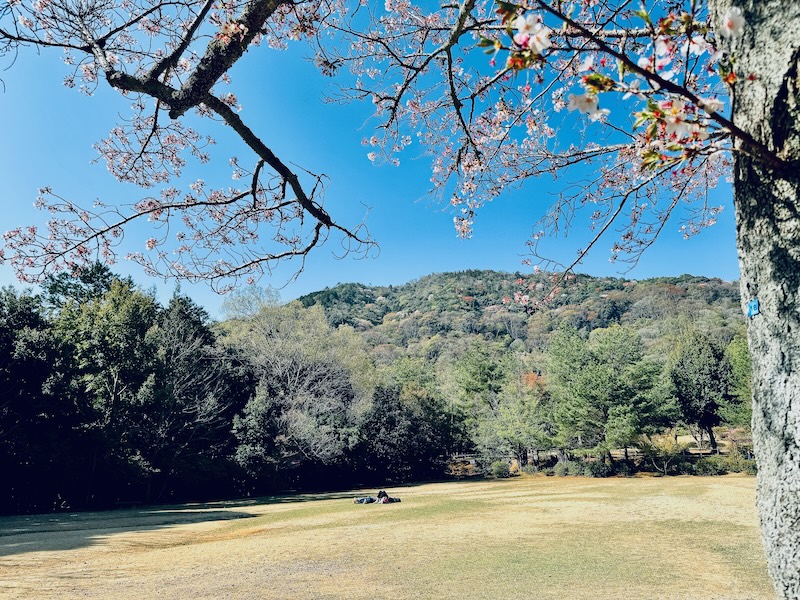 大河内山荘側出入口から入ってウホウホなほどの”右方”には、奈良鹿が飛び跳ねて喜びそうな芝生広場が広がる。