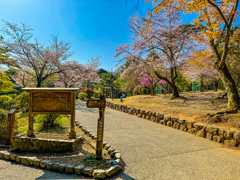 嵐山公園(亀山公園)では、ソメイヨシノのほか、ヤマザクラや和様を最大限に醸す枝垂れ桜も観られる。