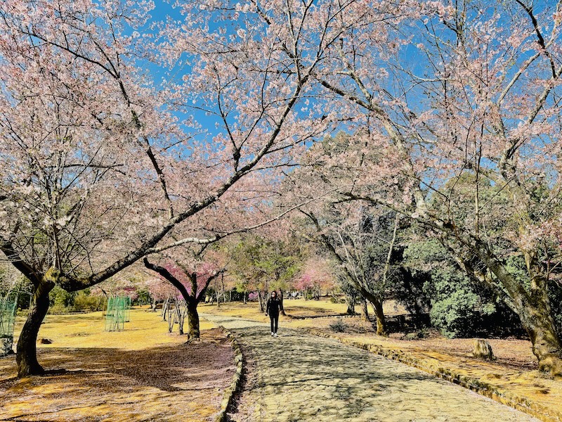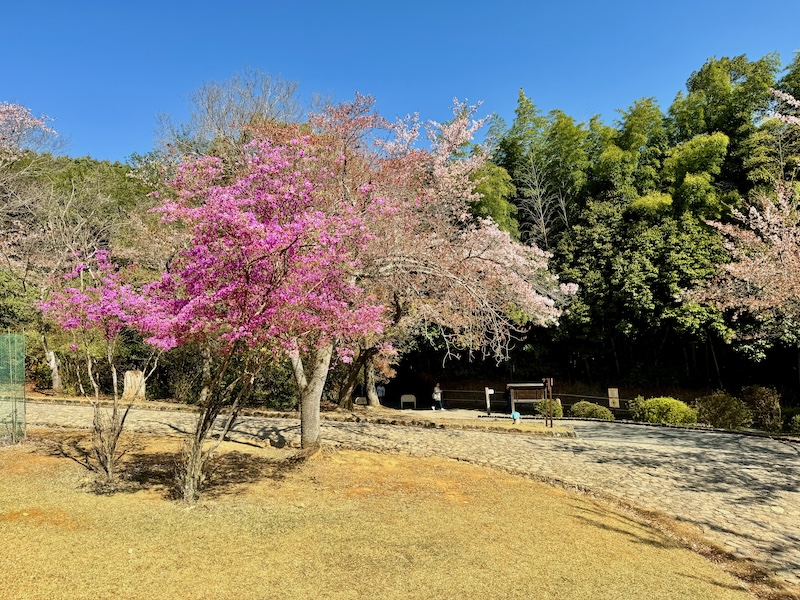濃いピンク色の花弁をもつ寒緋桜と、薄いピンク色の花びらをもつソメイヨシノや枝垂れ桜とのコントラストが、まるで一枚の絵画ように楽しめる。