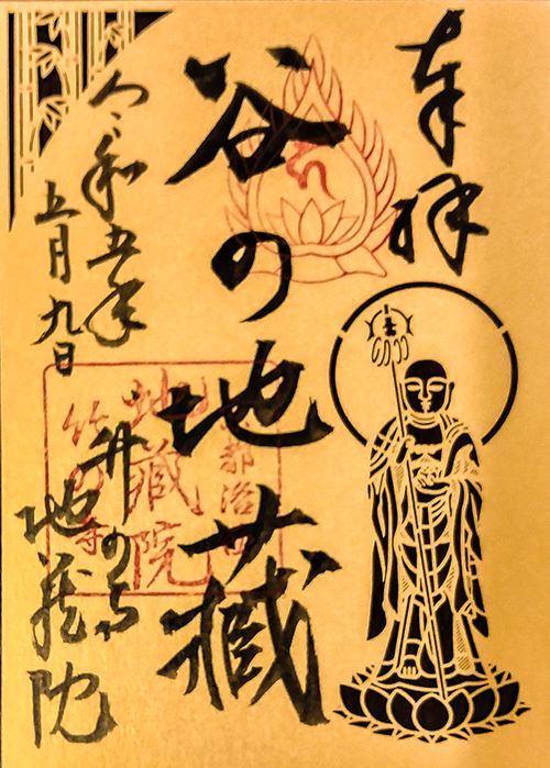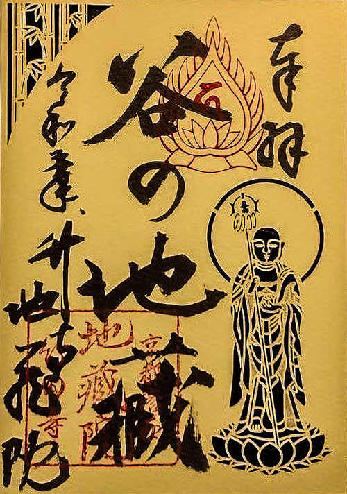 デザイン的構図では、上記、「ご本尊地蔵菩薩の切り絵」と同様。大きく異なるのが御朱印紙が黄色(金色)になっていることや、中央に大きく「谷の地蔵」と墨書きされている点が挙げられる。