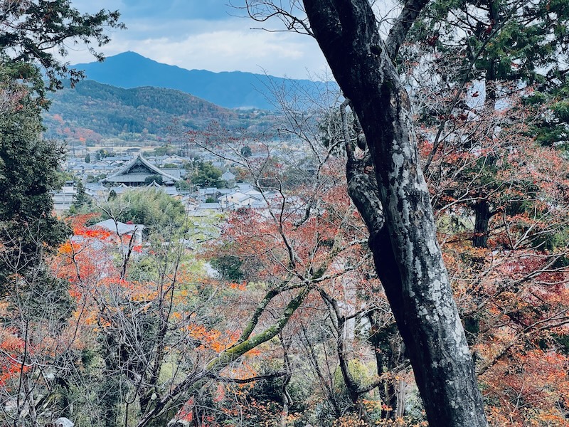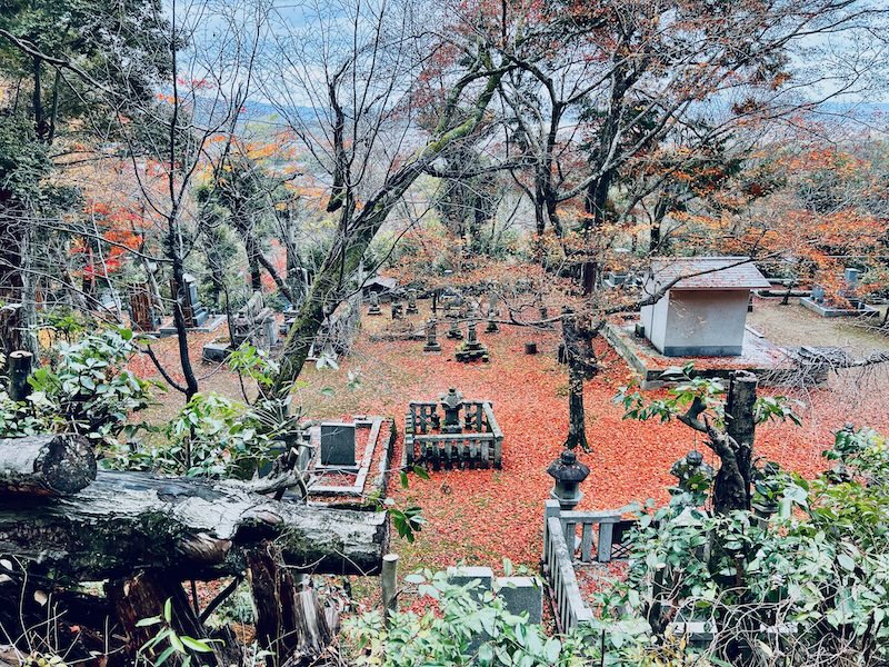 本堂裏の小倉山中腹に広がる墓苑の紅葉の様子