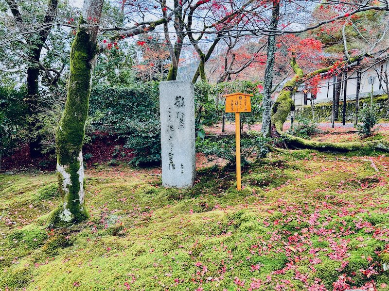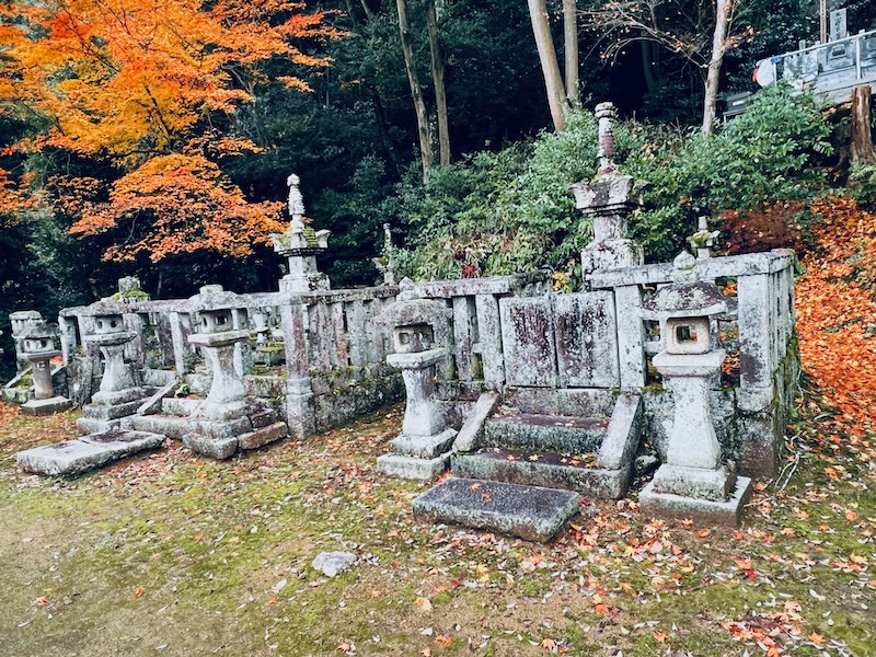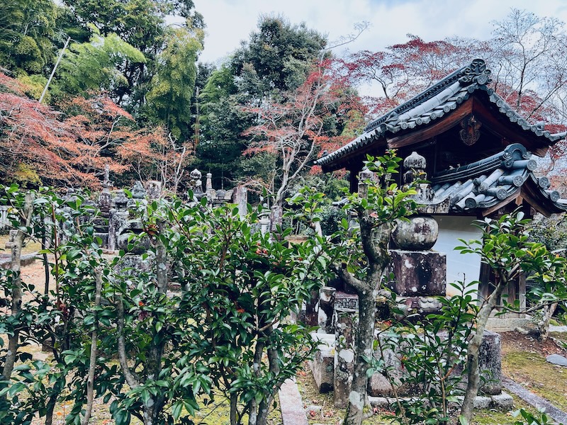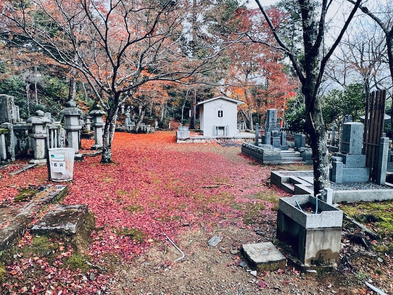 苔むした風化した独特の風合いの墓石と錦秋の紅葉が二尊院の秋の風趣に華を添‥えちゃぅ。